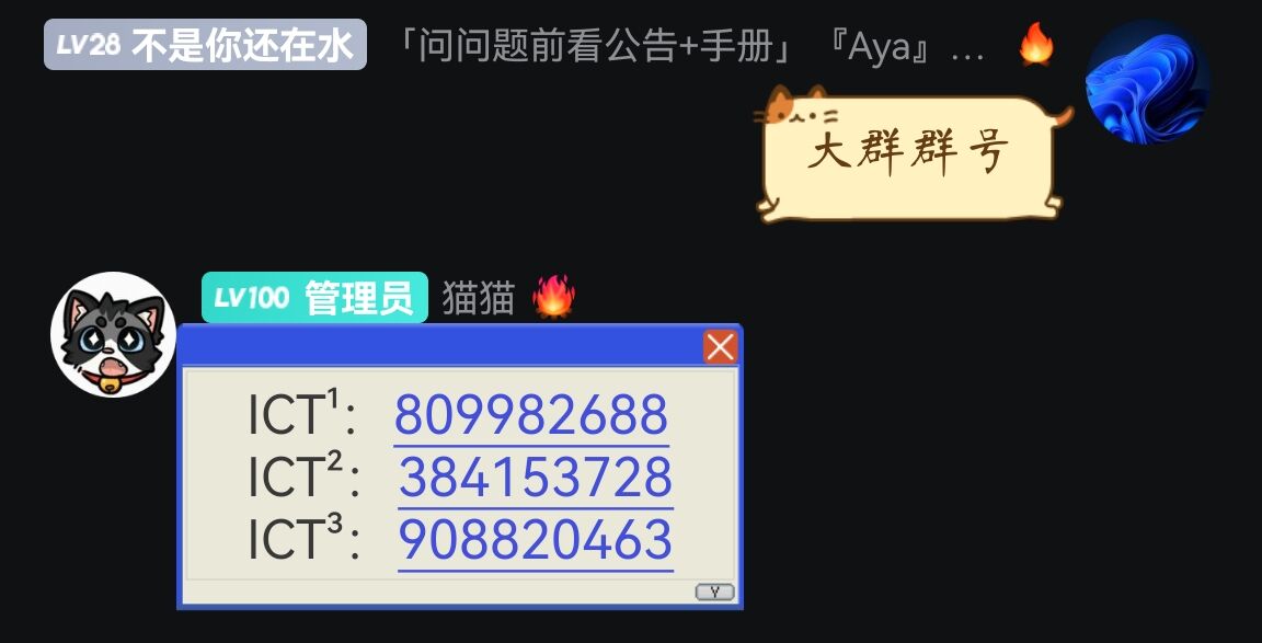- 在“ICT白名单审核群”(1022730166)中发送大群群号后,机器人猫猫@(106237496)会回复你大群群号,不在这里面的均不是大群。